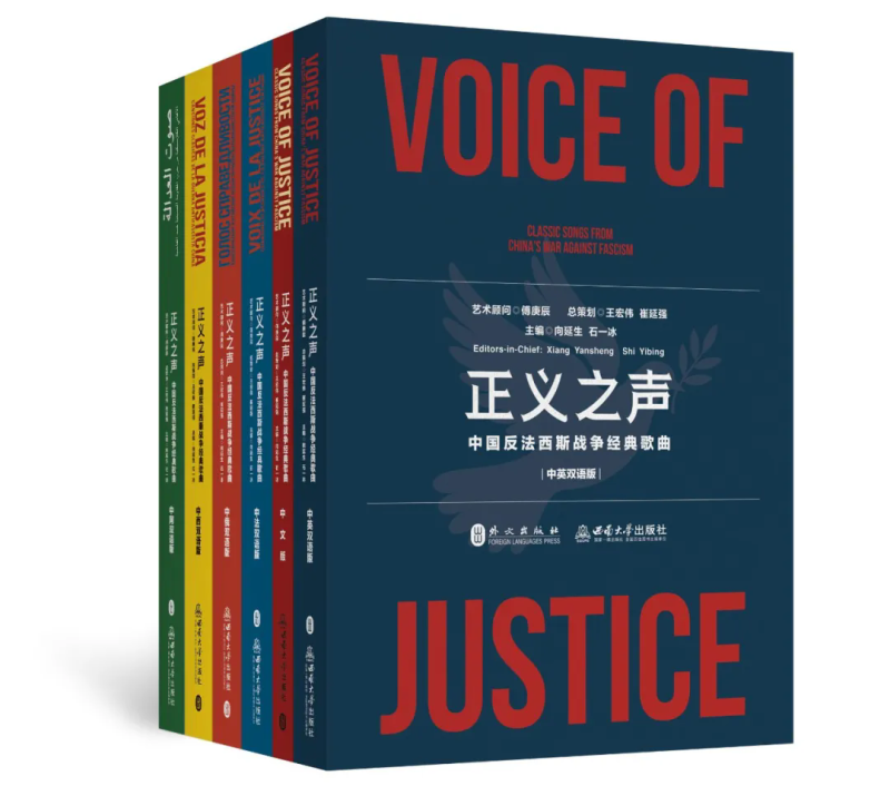 《正义之声:中国反法西斯战争经典歌曲》由外文出版社与西南大学出版社联合出版,天津音乐学院、中希文明互鉴中心、西南大学国际学院为项目支持单位,共出版中文、中英对照、中法对照、中西对照、中俄对照、中阿对照六个版本。